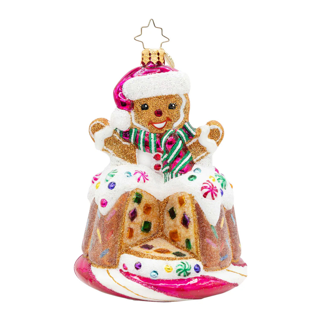 Bundt Surprise Ornament by Christopher Radko was handmade in Europe. This little gingerbread man is surprising his friends by popping out of a bundt cake covered in peppermint candies and sprinkles.