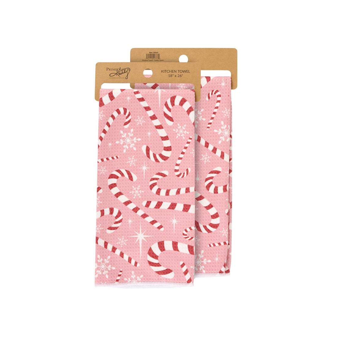 Candy Canes Kitchen Towel from Primitives by Kathy. Â If you have a candy or peppermint theme in your kitchen for the holidays, then you may want to add this cotton towel to your decor. It features a pastel pink towel with a scene of candy canes, snowflakes, and north stars. Measures 26 inches in length. Machine washable.