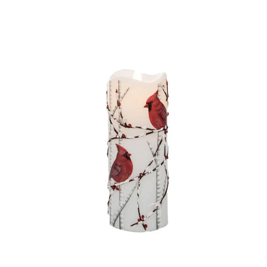 Enjoy the holiday season by lighting it up with this white candle that has a scene of red cardinals on a branch. Measures 8 inches in height. Also available in small #TC03201SM.