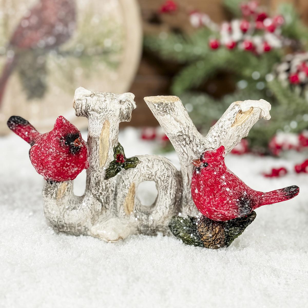 This item features the word âJoyâ accented with a look of wood and surrounded by a cardinal on each side. It measures 3.75 inches in height.