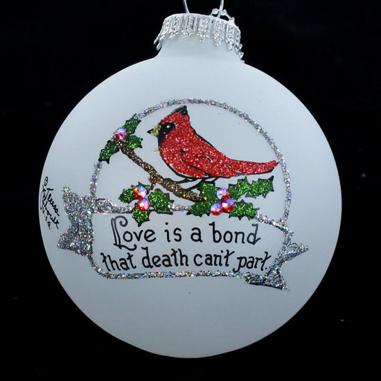 A hand painted glass ball ornament from a design inspired by Teresa Thibault features a glittered red cardinal perched on a glittered holly berry branch with a silver glittered banner saying "Love is a bond that death can't part" sentiment. A red cardinal symbolizes your loved one passed is visiting you in spirit and this is the perfect ornament to have or to gift. Made of glass and measures 4in H x 3.5in diameter.