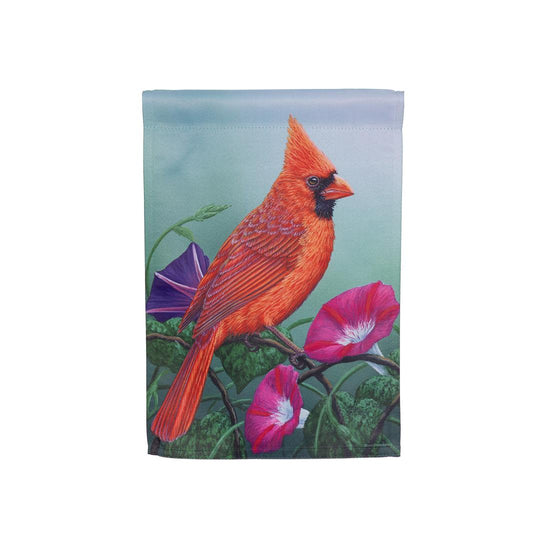 Celebrate the Spring season by displaying this Cardinal suede garden flag in your lawn. It features a red cardinal sitting on a branch surrounded by colorful blooming morning glory flowers. Measures 18 inches in height.