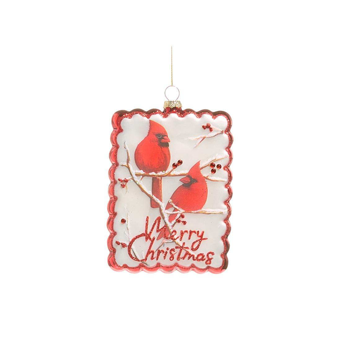 They say that cardinals appear when passed loved ones are near. Find comfort in displaying this ornament in your home for the holidays. It features a square disk with a Winter scene of two cardinals perched on berry branches with snow and the words âMerry Christmasâ in red letters. Measures 5 inches in height.