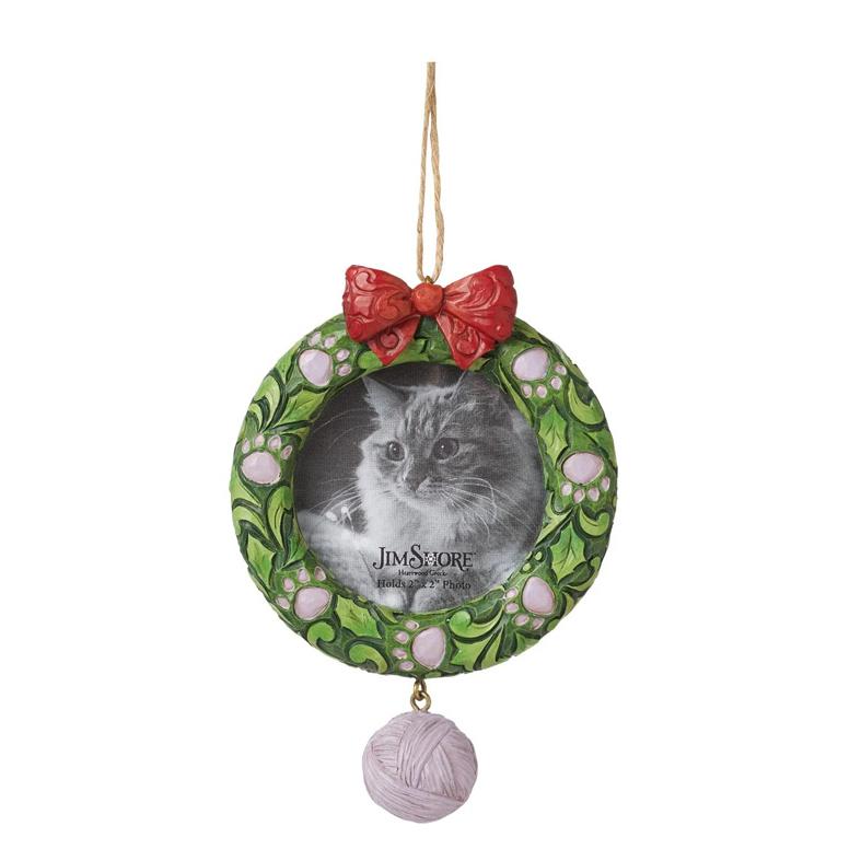 We all love our pets and love to show them off. Add this cat wreath ornament to your tree this year with a picture of your favorite companion. The wreath is covered with paw prints, a big red bow on top, and a ball of yarn dangling underneath. Created by Jim Shore and measures 4.92 inches in height.