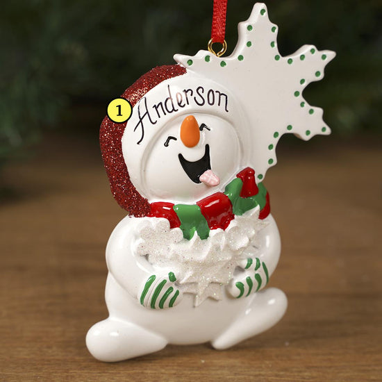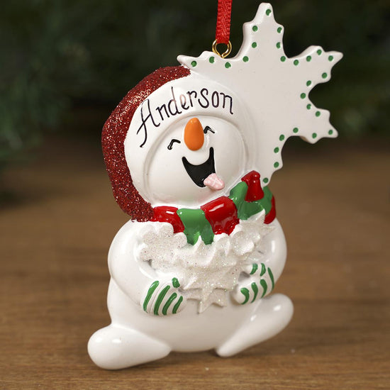 This ornament features a snowman catching snowflakes on his tongue. It can be personalized and measures 4 inches in height.
