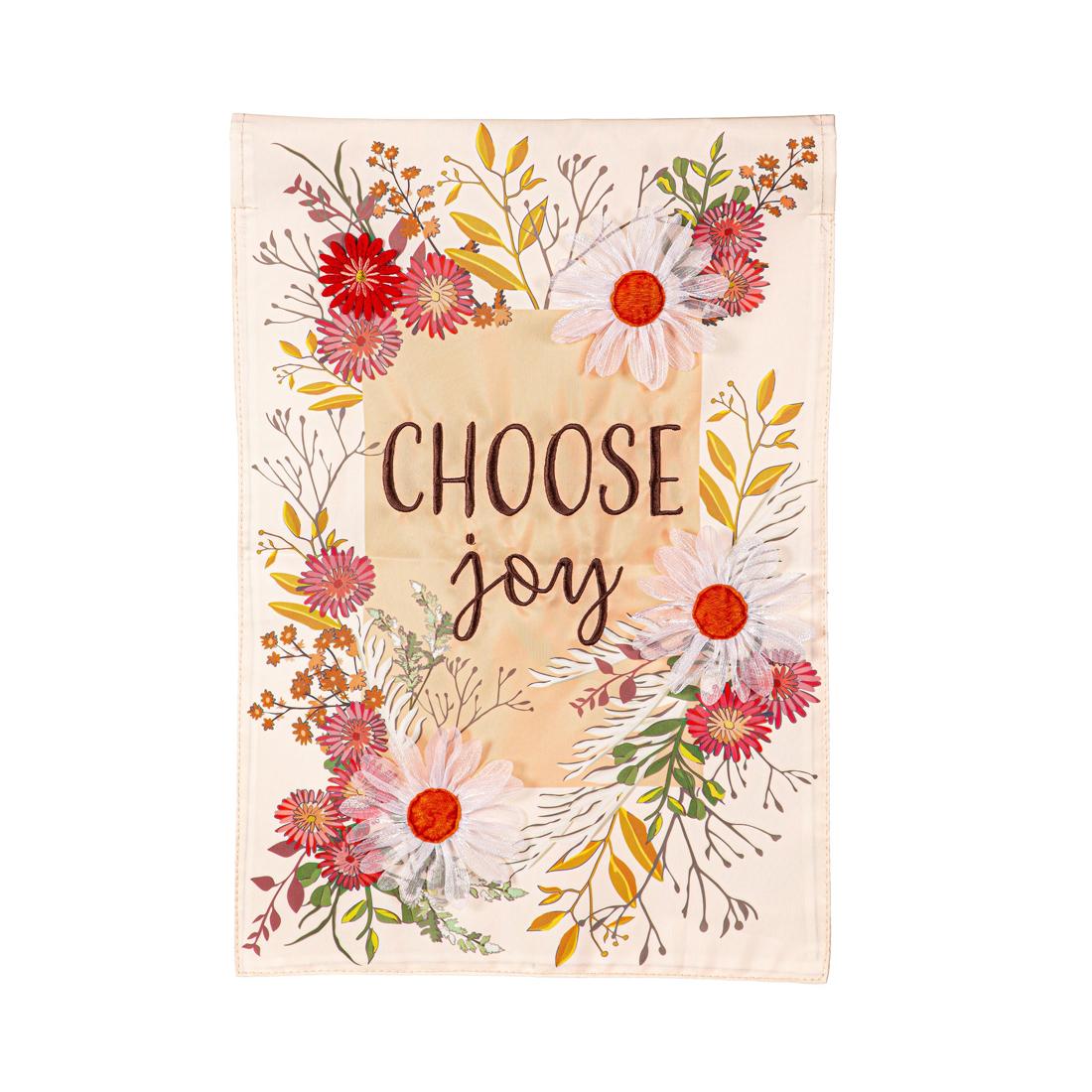 Remind your friends and neighbors of true inner happiness with this garden flag. It features beautiful blooming flowers and the words âChoose Joyâ. Measures 18 inches in height.