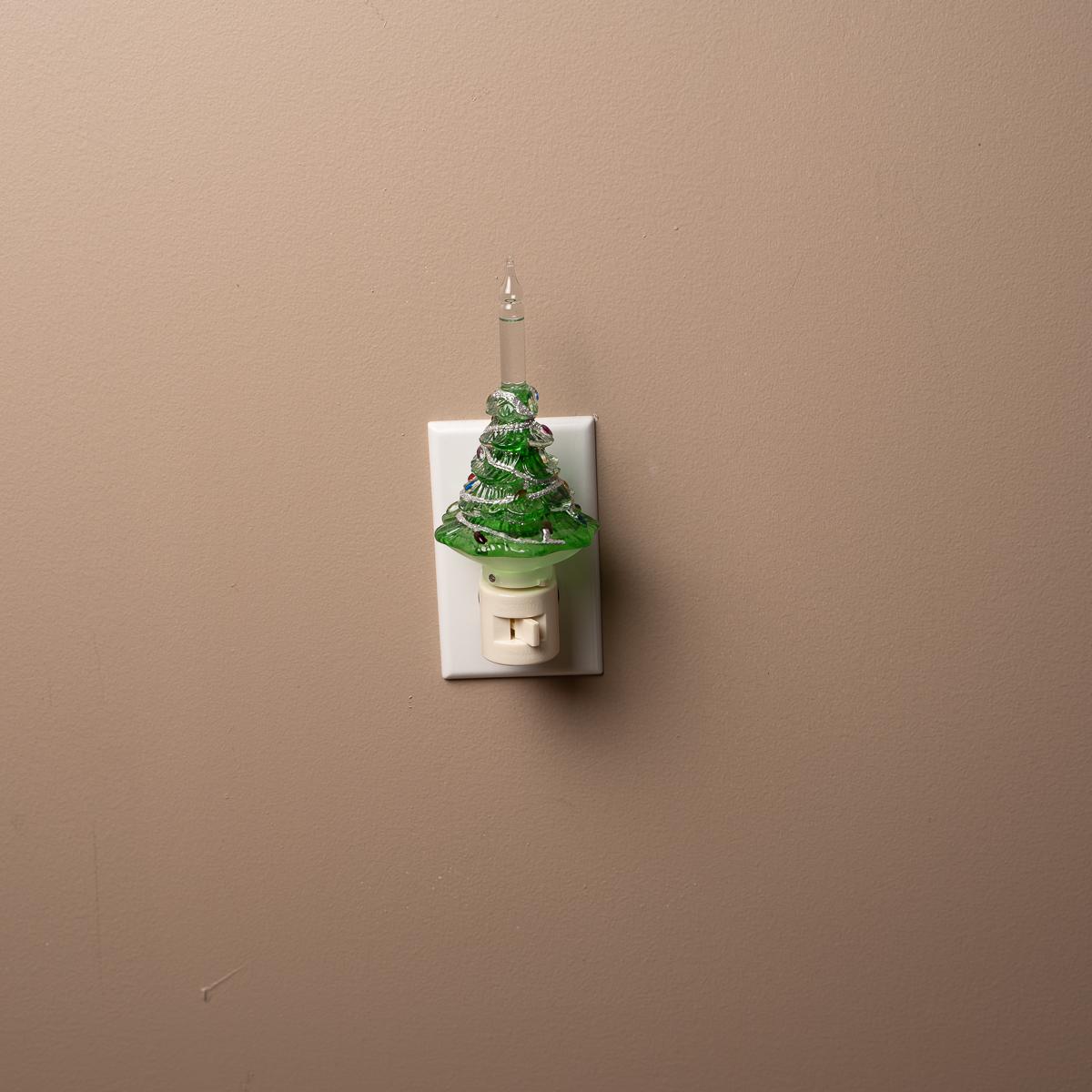 This bubble nightlight features a decorated Christmas tree and measures 7 inches in height.