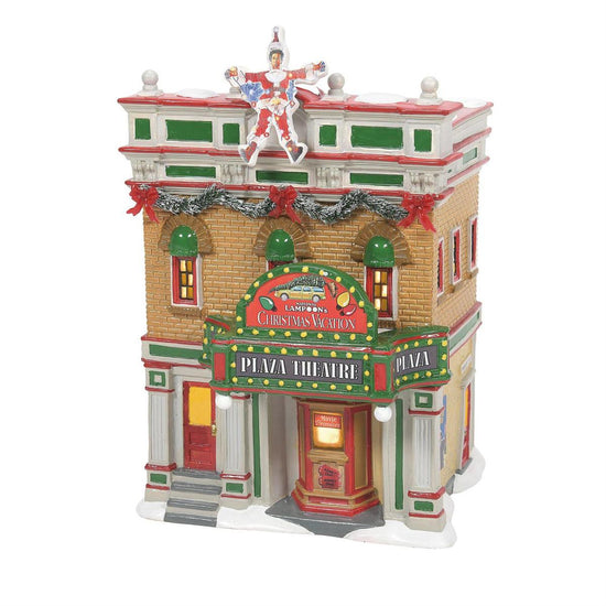 The National Lampoons Christmas Vacation Plaza Theatre is showing a movie premier. It is part of the Snow Village collection and measures 8.9 inches in height.
