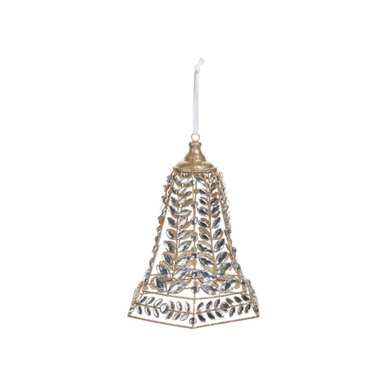 Add a touch of elegance to your holiday decor with this jeweled bell ornament. It features clear jewels and gold leaves on vines shaping a bell. Measures 12.5 inches in height.