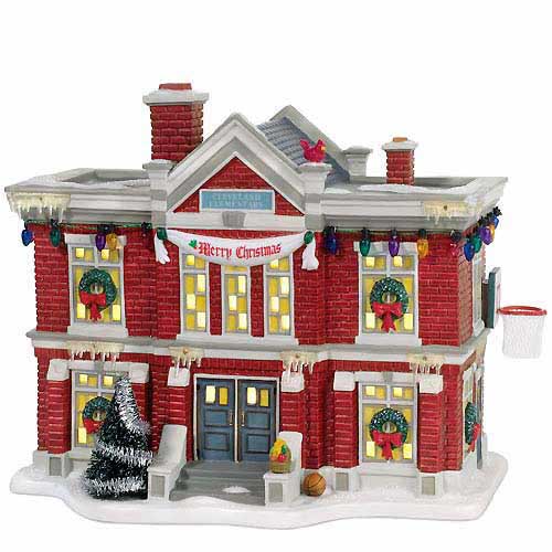 Cleveland Elementary is the school from the classic The Christmas Story movie. A Merry Christmas banner hangs above the second story windows and there are Christmas lights strung around the edges of the roof. Notice that there is also a basketball hoop mounted to the side of the building. Oversized fruit basket that Ralphie brings his teacher is shown on the front steps. Lightcord included.