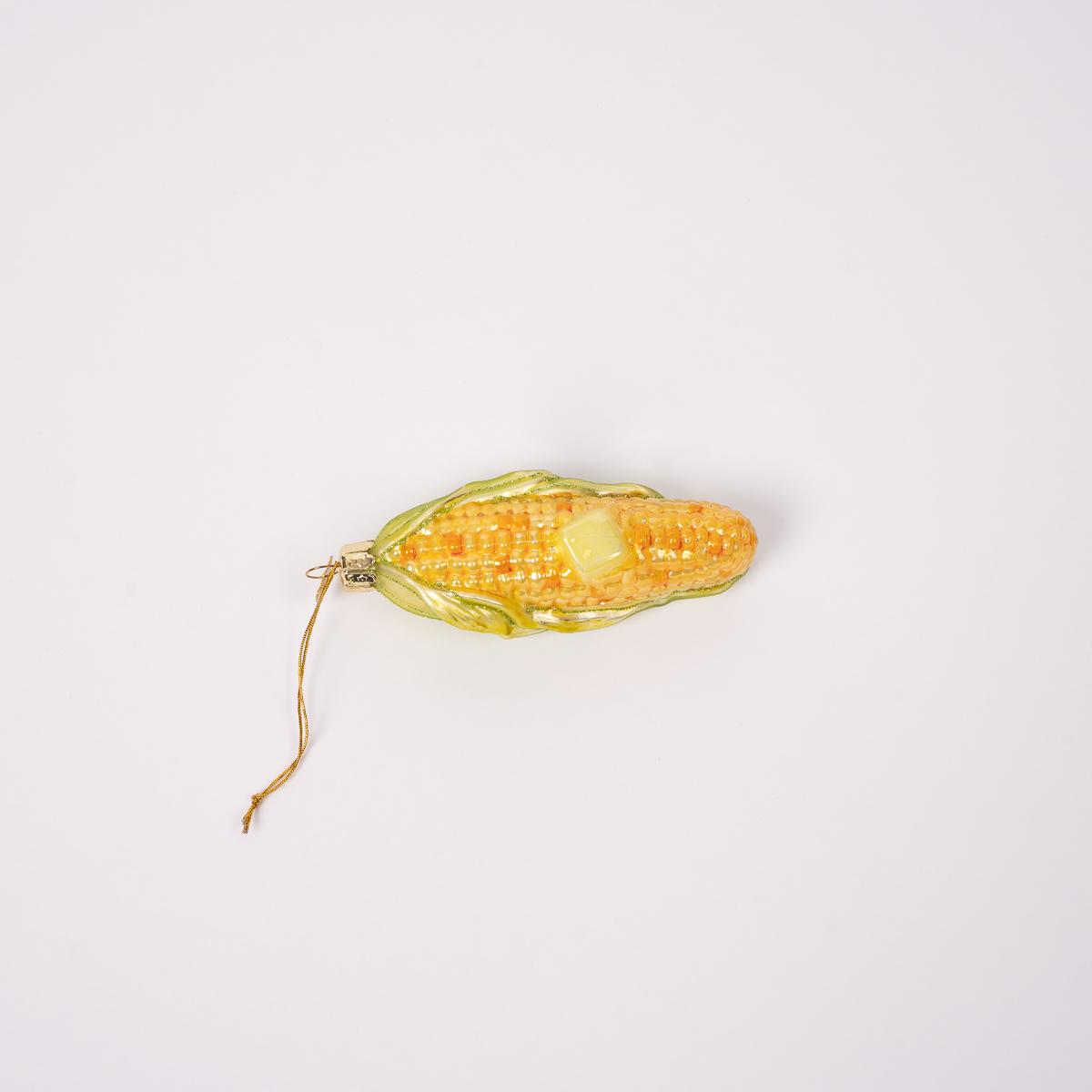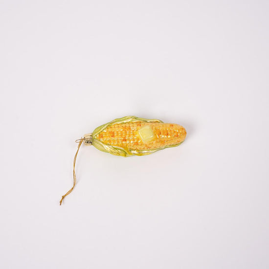 This ornament features a piece of corn on the cob with melting butter on it. It measures 4.125 inches in height.