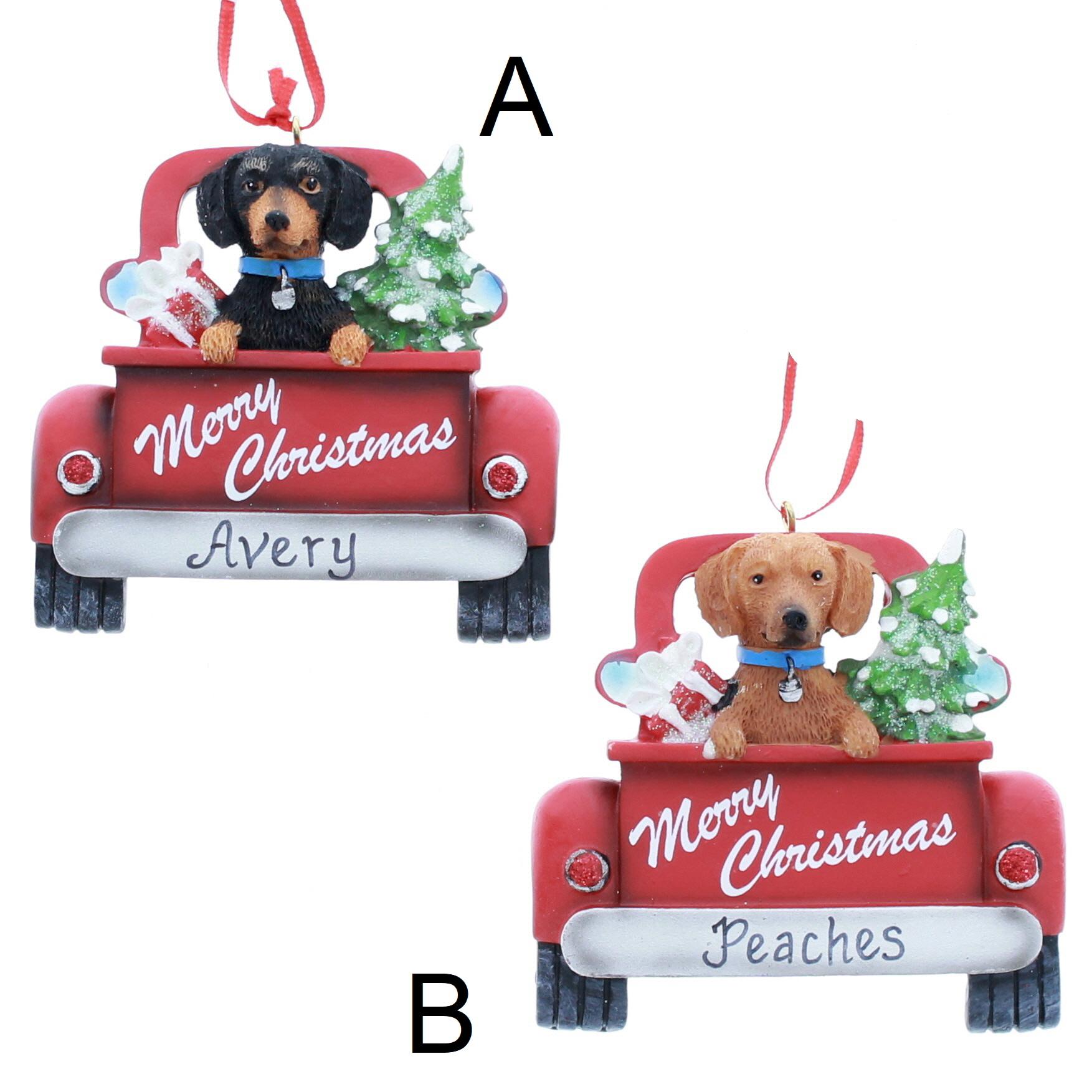 For the Dachshund dog owner, this personalizable Kurt Adler ornament is perfect for you. It features a red or black and tan Dachshund in the back of a red pickup truck with "Merry Christmas" written on the tailgate, a decorated Christmas tree and gift (each sold separately). Made of quality resin and measures 3.25in H x .5in W x 3.25in L.