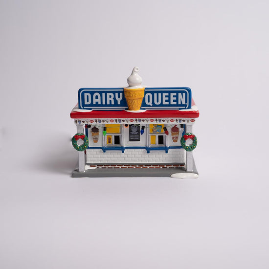 Our old fashioned Dairy Queen is a welcome treat to the folks in Snow Village. Designed with lots of vintage flair decals represent the menu boards and signage that decorates four sides of this charming ice cream parlor. Coordinates with âDQ Treats For Twoâ Item #282082.