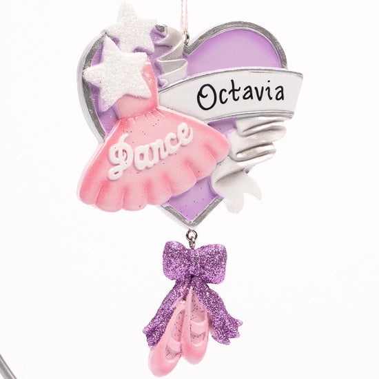 Celebrate your tiny dancer by having this ornament personalized with their name. It features a purple heart with a pink tutu that says "Dance" across the front, and pink ballet slippers that dangle from the bottom. Measures 4.5 inches in height.