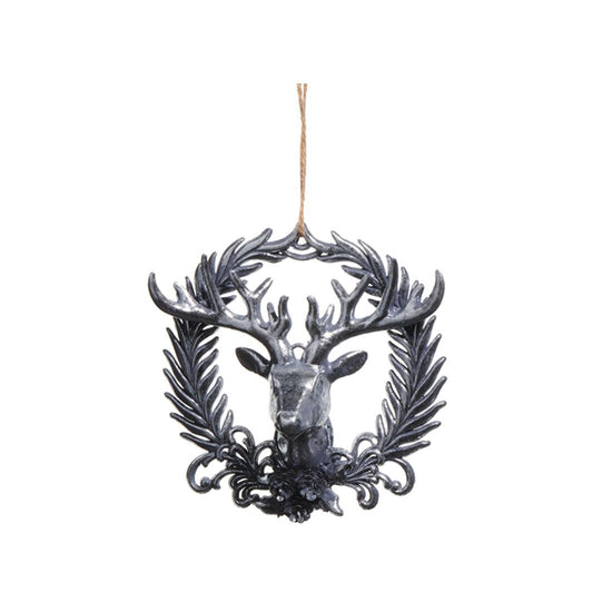 Add a touch of nature to your home decor with this ornament. It features a silver wreath surrounding a deer head with large antlers. Measures 5.75 inches in height.