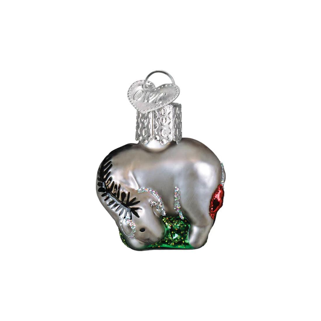 Eeyore Mini Ornament by Old World Christmas. This mini ornament features Eeyore eating some grass while wearing his red ribbon on his tail. Measures 1.5 inches in height.