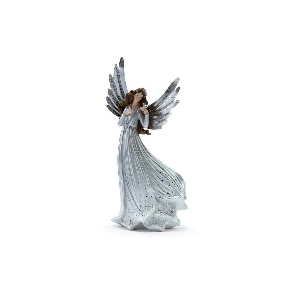 Add some beauty and elegance to your home decor with this elegant silver wing angel. It features an angel with brown hair dressed in a gray flowing dress with sparkles and silver wings, and a bird perched on her hand.