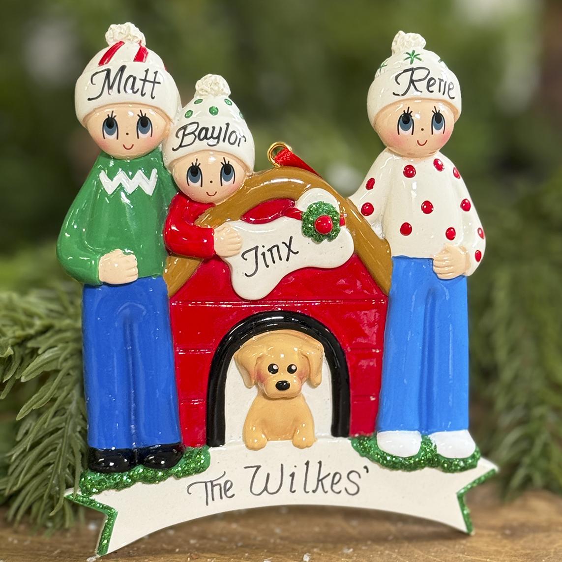 Customize this ornament with the names of your loved ones. It features a family of three standing by the dog house with their loyal friend inside.