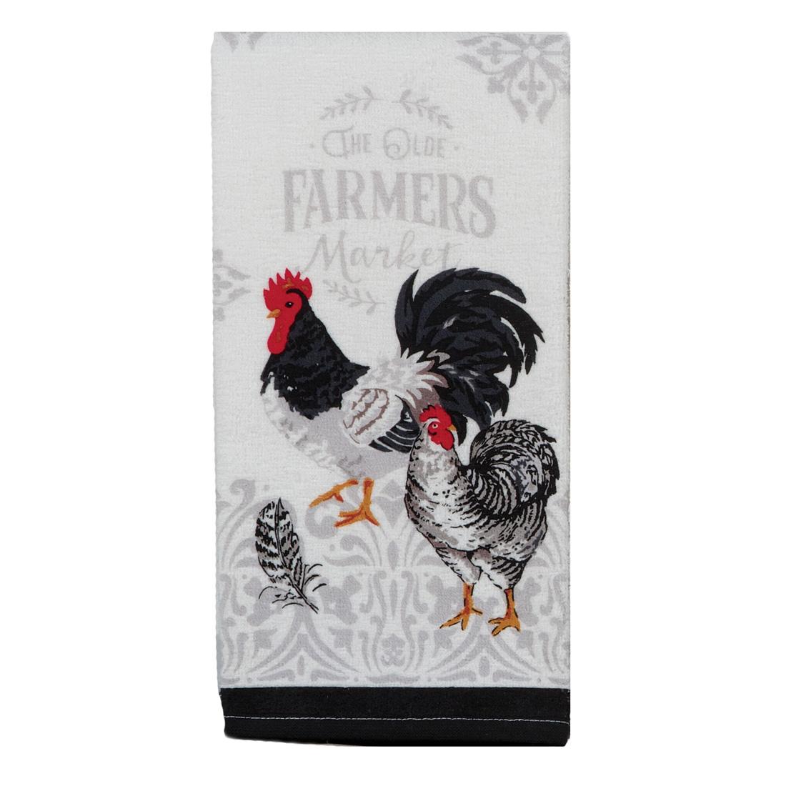 If you love the farm life, then you may want to add this towel to your kitchen decor. It features a black and white hen and rooster underneath the words âThe Olde Farmers Marketâ. Measures 26 inches in length.