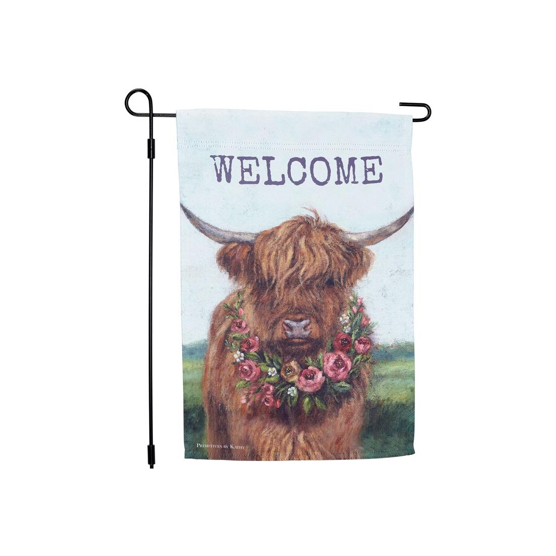 Floral Highland Garden Flag from Primitives by Kathy. Greet your guest with this double sided polyester flag displayed in your lawn. It features a highland cow wearing a wreath of colorful flowers and the word âWelcomeâ. Measures 18 inches in length. Flag pole not included. Flag is weather resistant, hand wash only.