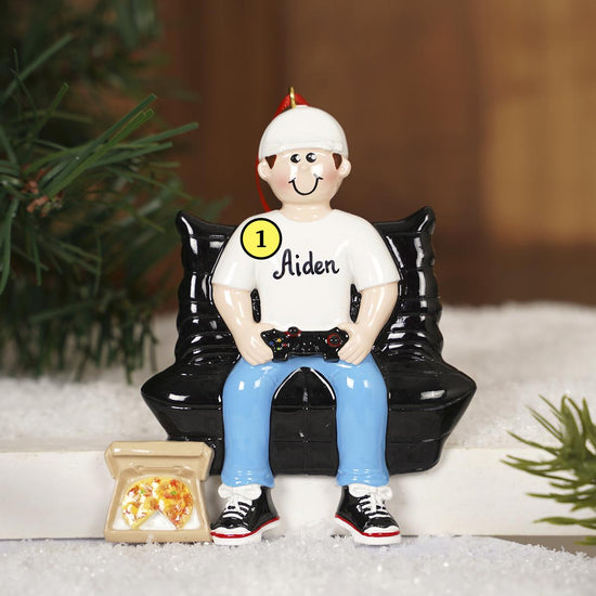 Have this ornament customized for the gamer in your life. It features a boy sitting on a black chair with his gaming remote in hand and a box of pizza at his feet.