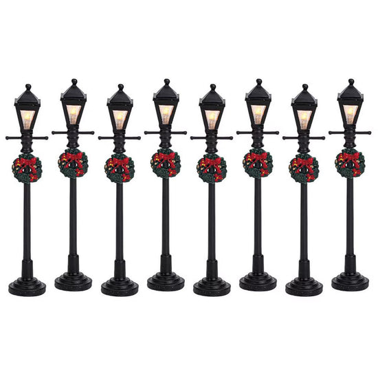 These gas lantern street lamps help to complete a Christmas village street and are a must have. There are 8 lamps decorated with a Christmas wreath and they stand 4.18 inches in height and are made of plastic.