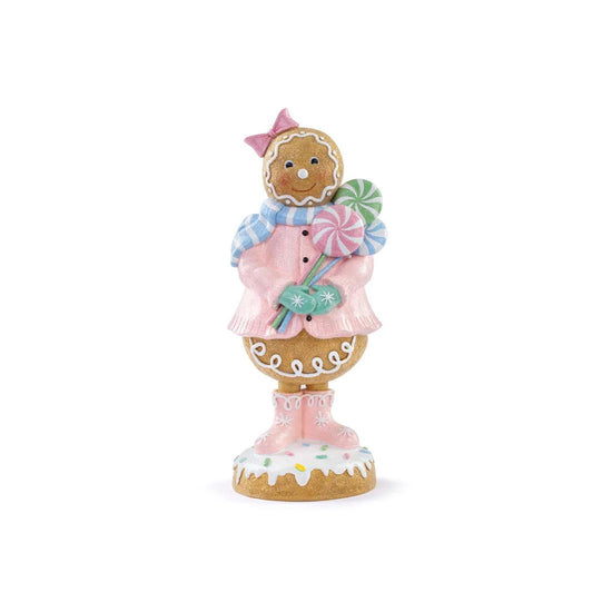 If you love gingerbread, then you may want to add this gingerbread girl to your home decor. She is wearing pastel colors of pink and blue while holding a bouquet of lollipops in her hand.