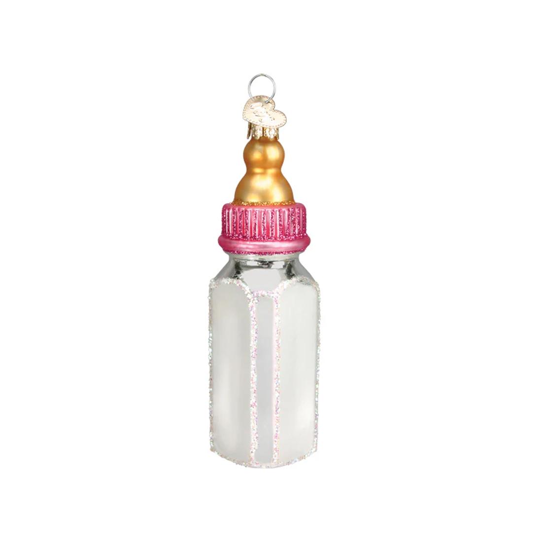 Girl Baby Bottle Ornament by Old World Christmas features a baby bottle with a pink top to welcome the baby girl in your life. Measures 4 inches in height.