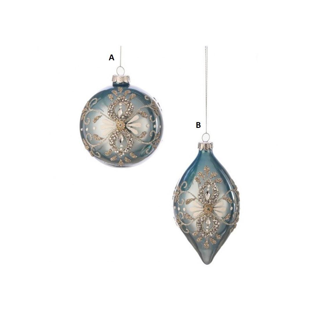 Add a touch of elegance to your holiday decor with this assortment of ornaments. It features a blue platinum ball or finial ornament with jewel designs on them. Each sold separately and measure 4 - 6 inches in height.