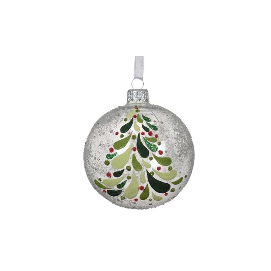 Add a touch of elegance to your holiday decor with this glass ornament. It features a silver ball with different shades of green strokes that form a tree with red and green dots. Measures 3.15 inches in diameter.