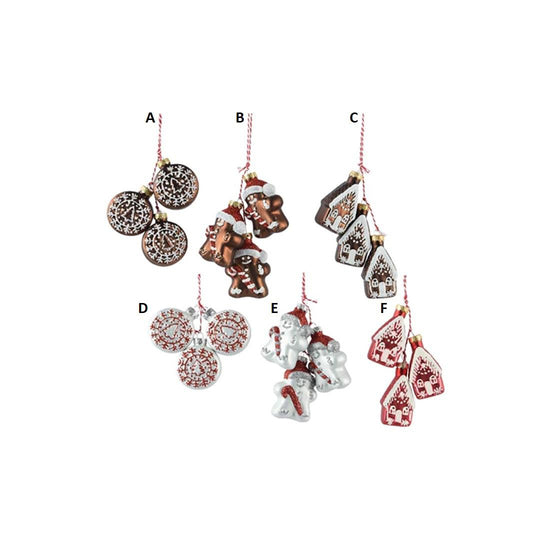 Add a little fun to your holiday decor with this assortment of glass ornaments. It features six different ornaments to choose from. One choice is a brown disk with white designs or a white disk with red designs. Another choice is a gingerbread man wearing a red Santa hat while holding a candy cane or a snowman wearing a Santa hat while holding a candy cane. Another choice is a brown gingerbread house with white icing or a red gingerbread house with white icing. Each sold separately and measure 2.48 inches in height.