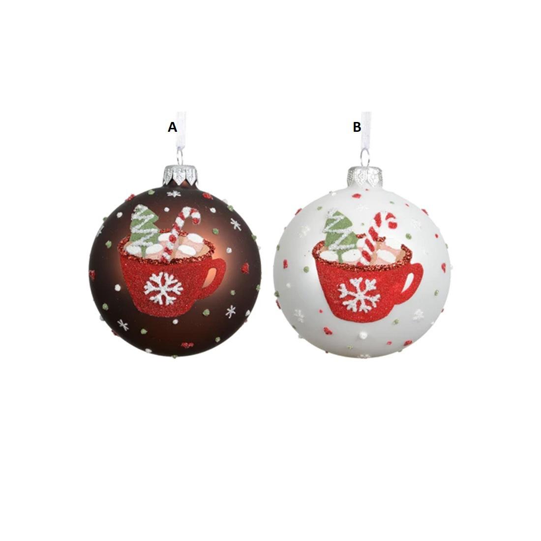 Add a touch of warmth to your holiday decor with this assortment of glass ornaments. It features a brown or white ball with a red cup of hot cocoa on each one. The cup of cocoa has marshmallows and candy canes in them and a snowflake on the outside. Each sold separately and measure 3.15 inches in diameter.