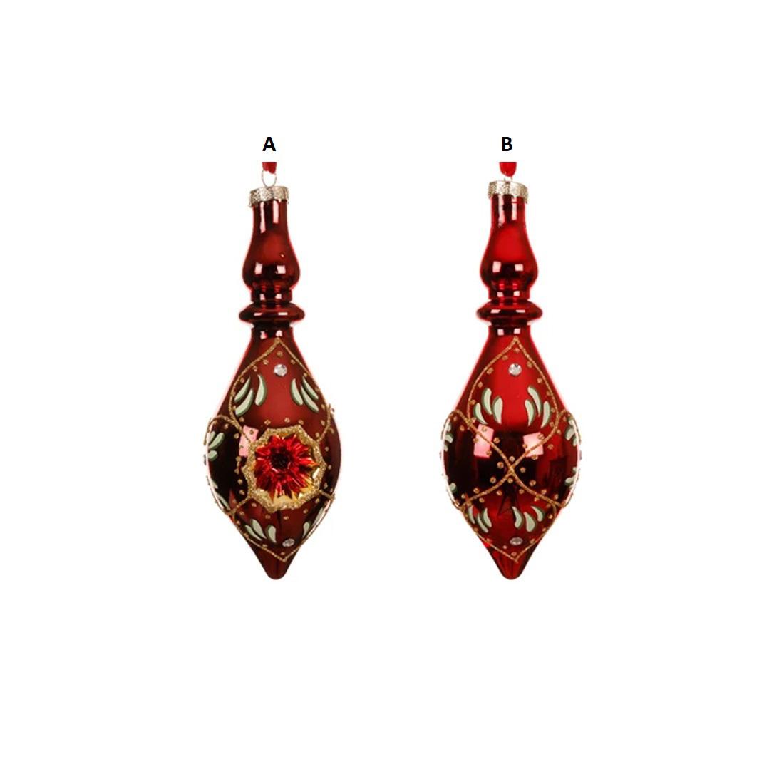 Add a touch of elegance to your holiday decor with this assortment of glass ornaments. It features two red finials with gold and green accents to choose from. Each sold separately and measure 7.48 inches in height.