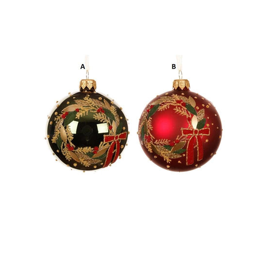Add a touch of elegance to your holiday decor with this assortment of glass ornaments. It features a green or red ball, each with a gold wreath decorated with a big red bow. Each sold separately and measure 3.15 inches in diameter.