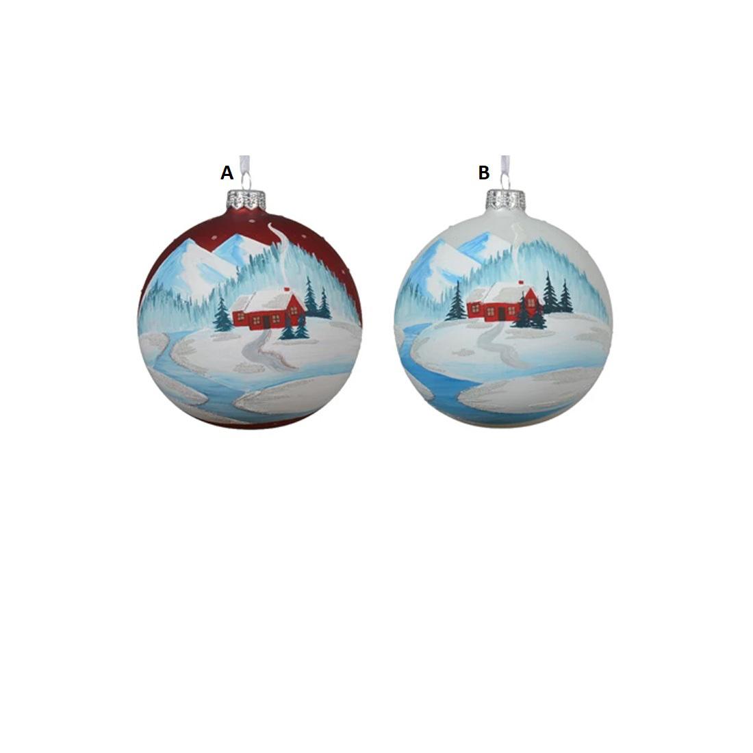 Add a touch of elegance to your holiday decor with this assortment of glass ornaments. It features a red or white ball with a wintery scene of red cabin surrounded by streams and trees with mountains in the background. Each sold separately and measure 3.94 inches in diameter.
