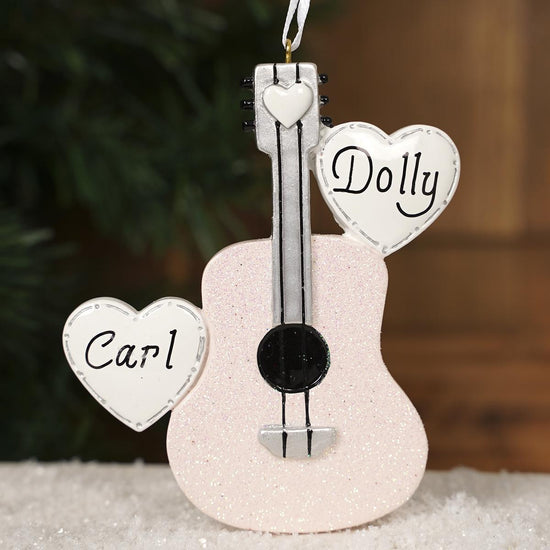 Have this ornament personalized with the names of your favorite music lovers. It features a glittery guitar with a big heart on each side and a small heart on the strings.