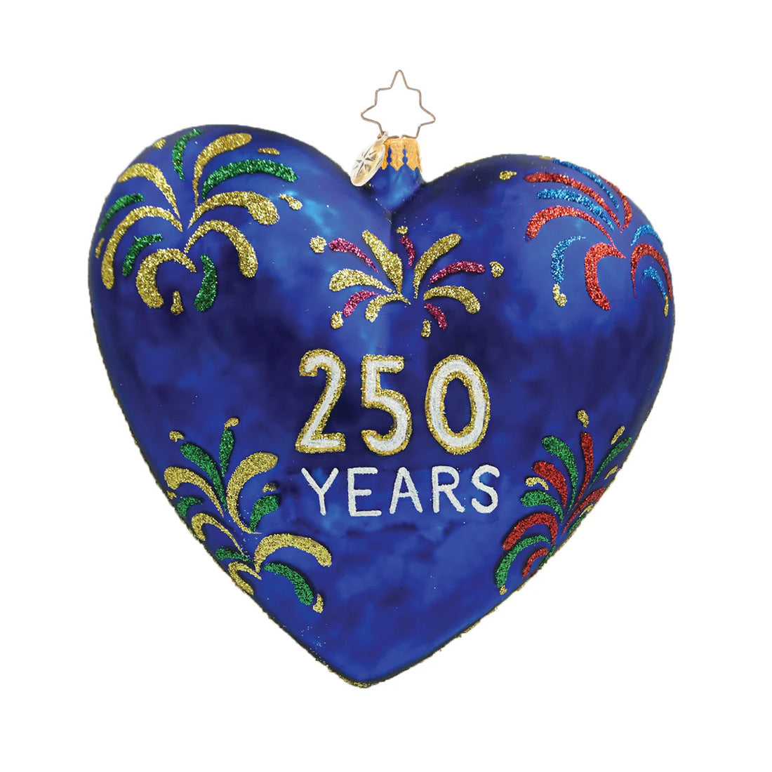 Heart Of Independence- 250 Years Ornament by Christopher Radko was handmade in Europe. Celebrate 250 years of freedom by displaying this ornament in your home. It features stars and stripes on one side and fireworks with a blue background and the words “250 Years” on the other side.