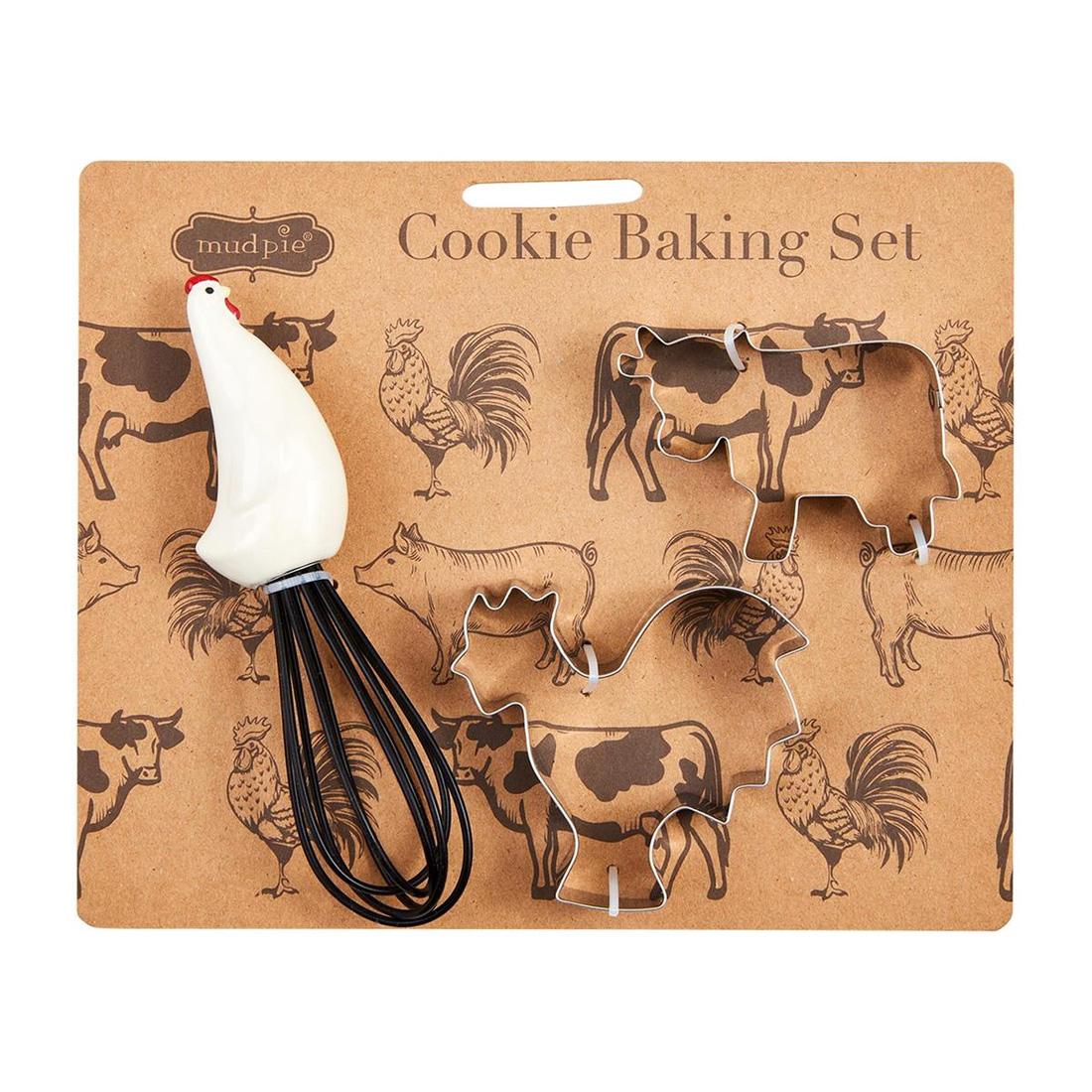 Add some fun to baking in your kitchen with this 3 piece cookie baking set. It features a chicken whisk, a cow cookie cutter, and a rooster cookie cutter. The whisk measures 5.5 inches in height, and the cookie cutters measure 3 inches height.