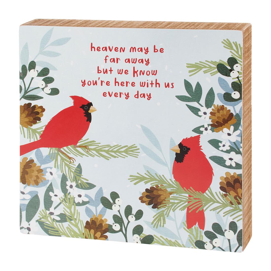 Primitives by Kathy created this wood box sign that features two red cardinals sitting on branches with the words âHeaven may be far away but we know that you're here with us every dayâ. Measures 10 inches in height.