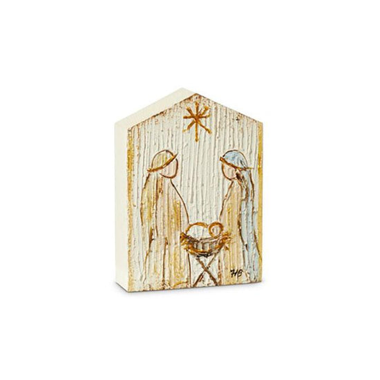 Show the true meaning of Christmas with this textured Holy Family block sign. It features the scene with Mary and Joseph watching over baby Jesus in the manger with the bright star above. Measures 7.75 inches in height.