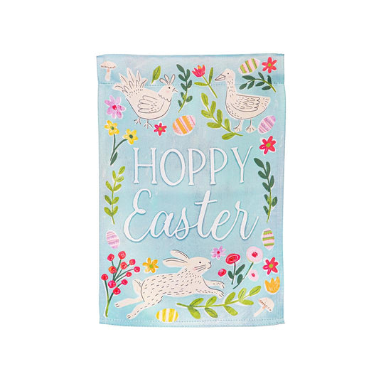 Celebrate Easter by displaying this garden flag in your lawn. It features a blue flag with flowers, a rabbit, a duck, and a chicken around the edges and the words âHoppy Easterâ in the middle. Measures 18 inches in height.
