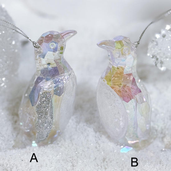 This assortment of iridescent ornaments feature penguins with silver on their wings. Each sold separately and measure 3.75 inches in height.