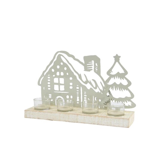 Light up your holiday season with this tealight holder. It features a white house with a big tree to the side and holds four tealights. Measures 70.9 inches in height.