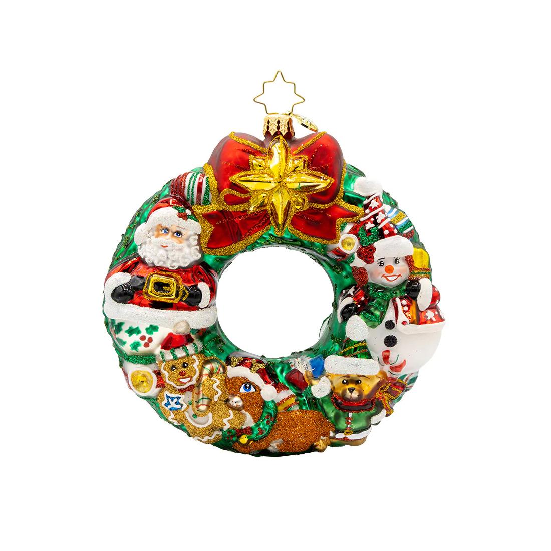 Jingle All The Way Wreath Ornament by Christopher Radko features a green wreath filled with loving characters and topped with a big red bow and gold star. The characters feature Santa, a gingerbread man, a reindeer, a teddy bear, and a snowman. Measures 5 inches in height.
