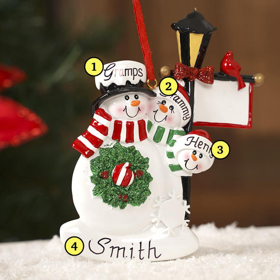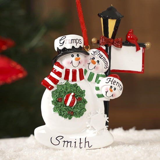 Customize this ornament with the names of your loved ones. It features a snowman family of 3 standing by a lamp post and enjoying the holiday season. Measures 4.75 inches in height.
