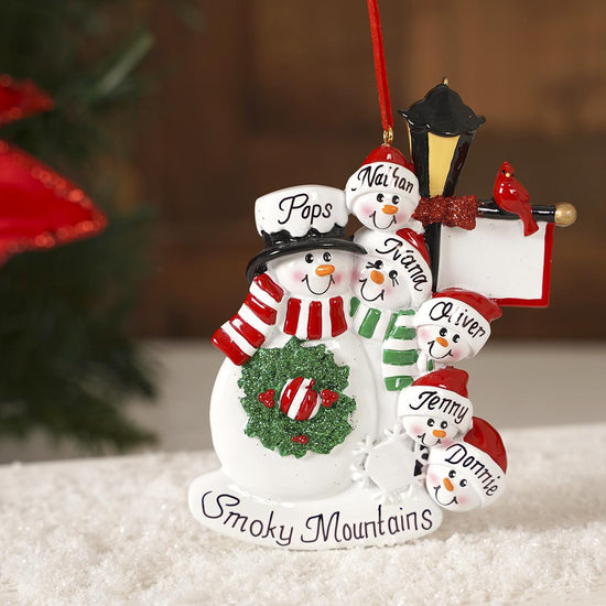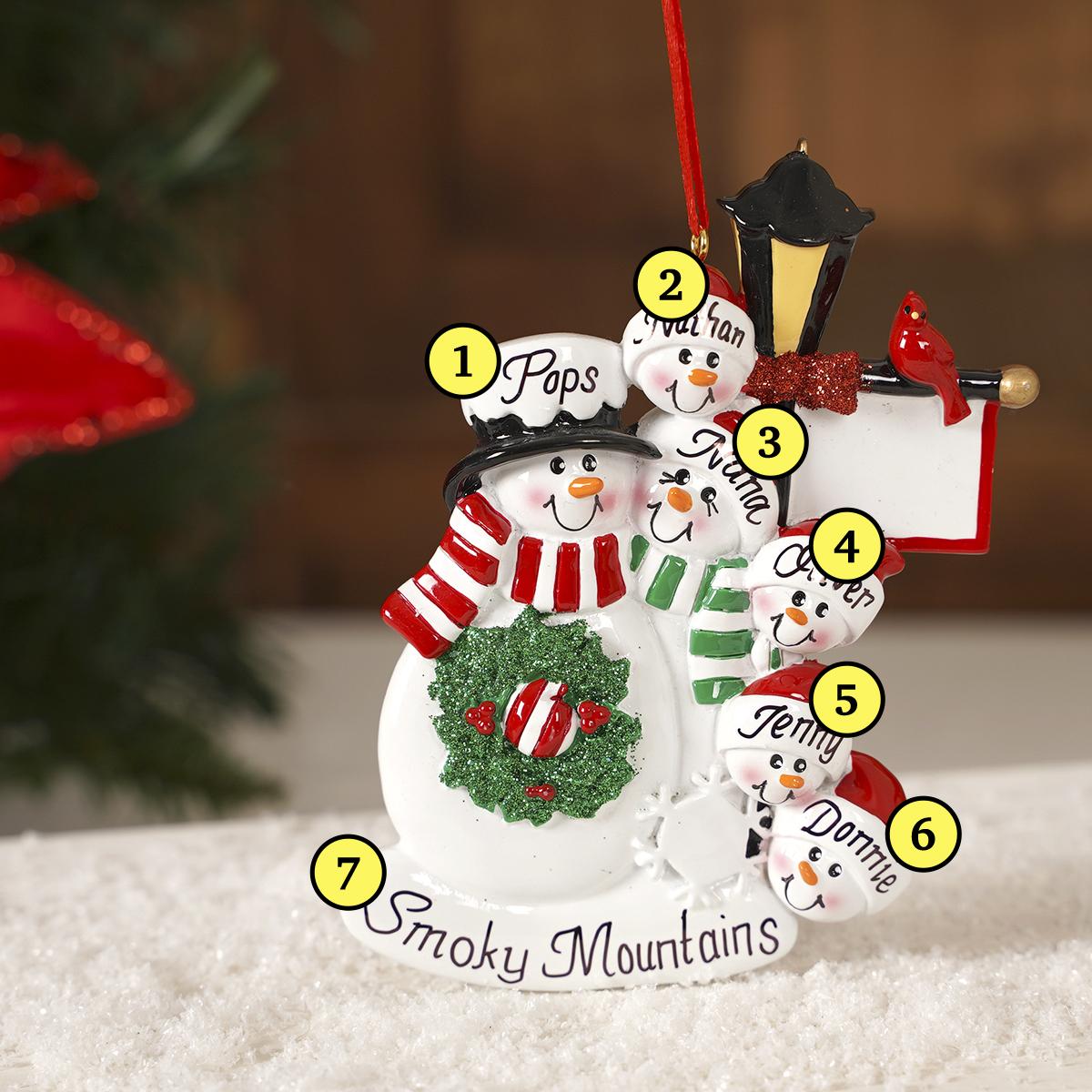 Customize this ornament with the names of your loved ones. It features a snowman family of 6 standing by a lamp post and enjoying the holiday season. Measures 4.75 inches in height.