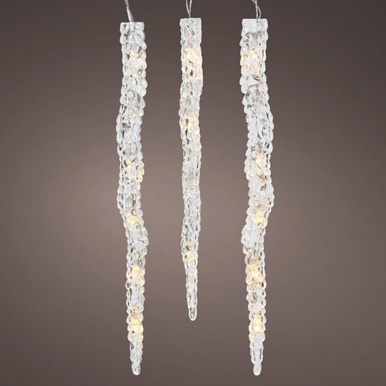 Warm White LED Icicle lights on transparent cord, with flashing effect. Measures 11.8 feet in length with 12 icicles on string with 5 micro bulbs in each for a total of 60 LED lights. Outdoor use.