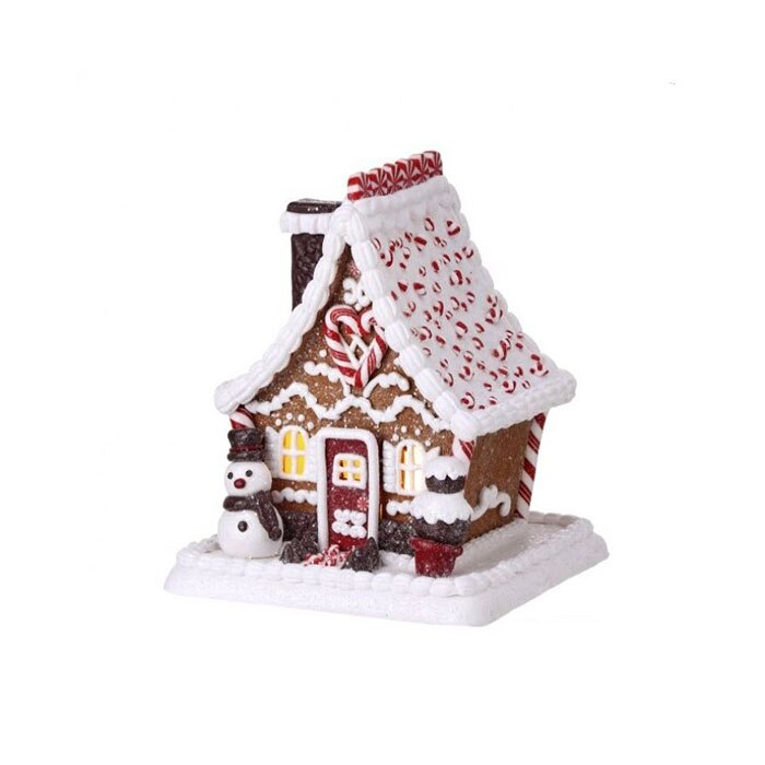 If you love gingerbread houses, then you may want to add this one to you holiday decor for Christmas. It features peppermint candies and candy canes on the roof, a candy cane heart above the door, and a snowman beside the door. Measures 7 inches in height and lights up with batteries. It is also equipped with a timer.