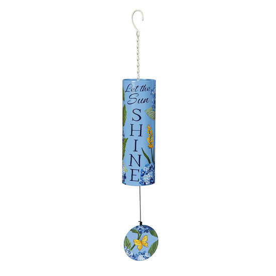 Enjoy the sound of chimes as a gentle breeze passes through this wind chime. It features a blue cylinder with flowers and butterflies and the words âLet the Sun Shineâ. Measures 36 inches in height.
