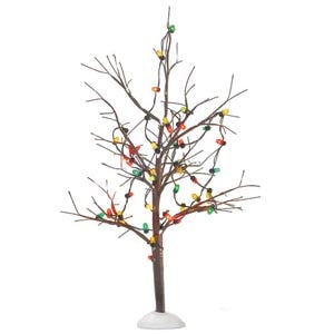 Accent the front yards of your Village houses with this lighted bare branch tree. It features strands of colorful lights strung throughout the branches. Battery pack included, requires 2 C batteries. Works with 55206 AC/DC Adapter or 53500 Building and Accessories Lighting System